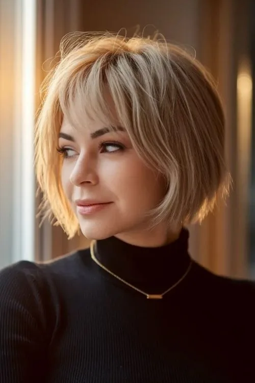 Soft, face-framing bangs that add the perfect touch of romance to your French bob! Whether you choose side-swept, wispy, or trendy curtain bangs, these styles create beautiful softness that complements round faces while maintaining that effortlessly chic Parisian vibe.