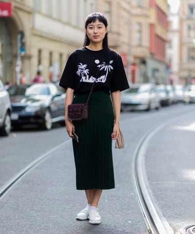 Tucking an oversized t-shirt into a midi skirt can create a sophisticated yet relaxed outfit. Look for skirts that flow beautifully to contrast with the boxy top, or go for a fitted pencil skirt for a sleek, chic vibe. Add heels or loafers to refine the look and accessorise with a statement necklace or bracelet. If it’s chilly, consider throwing on a cardigan or blazer for an extra layer that adds polish.