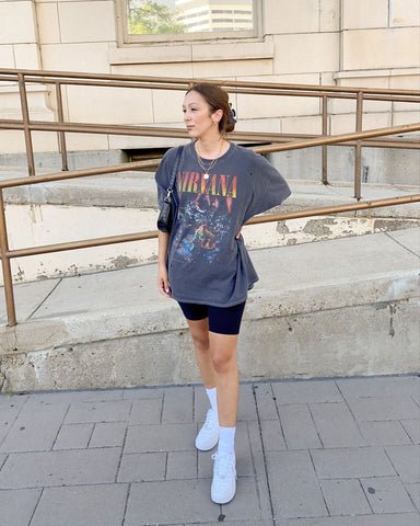 Pairing an oversized t-shirt with biker shorts creates a sporty, on-trend outfit perfect for casual outings. The shorts provide a sleek silhouette, balancing the relaxed fit of the t-shirt. Opt for bright sneakers to add colour and a playful touch. Complete the look with a baseball cap and a backpack for a cool, athleisure vibe.