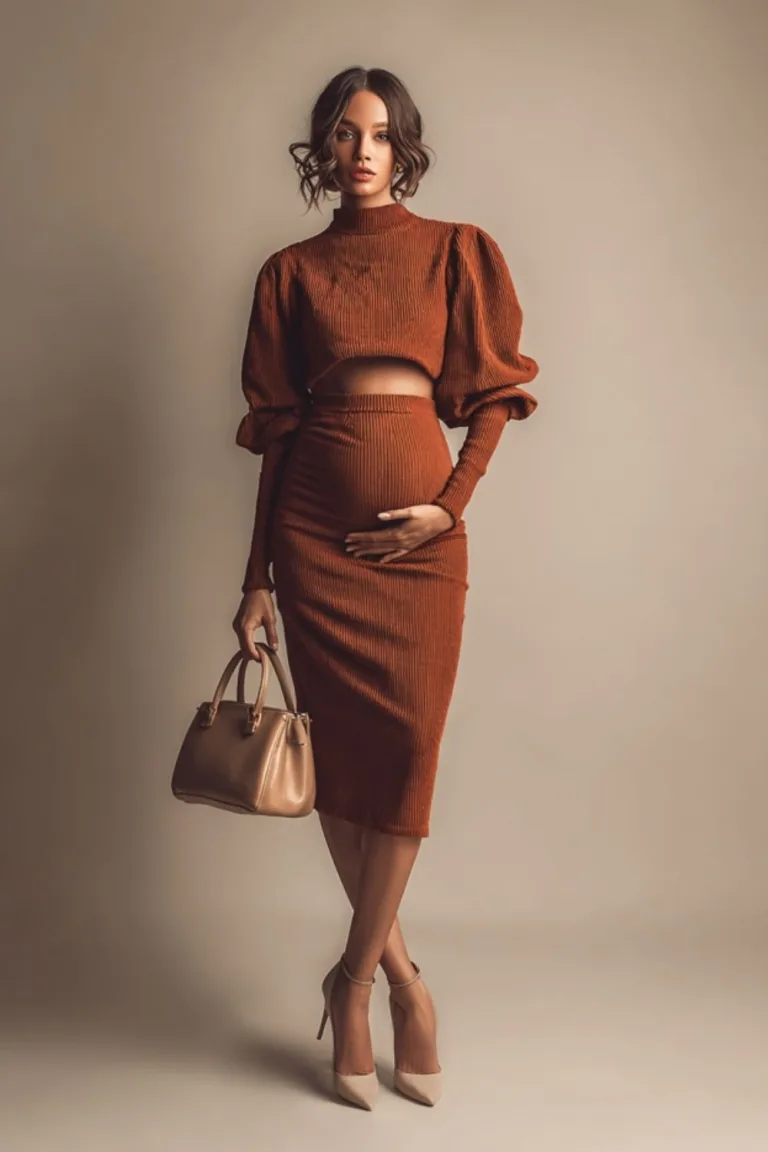 If you’re craving a more defined silhouette during pregnancy, maternity skirts paired with fitted crop tops deliver exactly that. This combination showcases your bump beautifully while maintaining shape and sophistication. You’ll find this approach works wonderfully for Valentine’s Day celebrations.